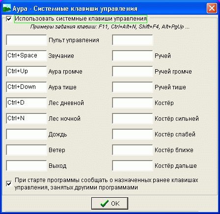 Аналогично Ctrl+"пробел" для вкл/выкл звучания и Ctrl+D да Ctrl+N для переключения между дневной и ночной аурами.