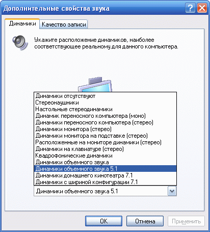 Очень важно соответствие установок в системной "Панели управления" реальному набору динамиков: